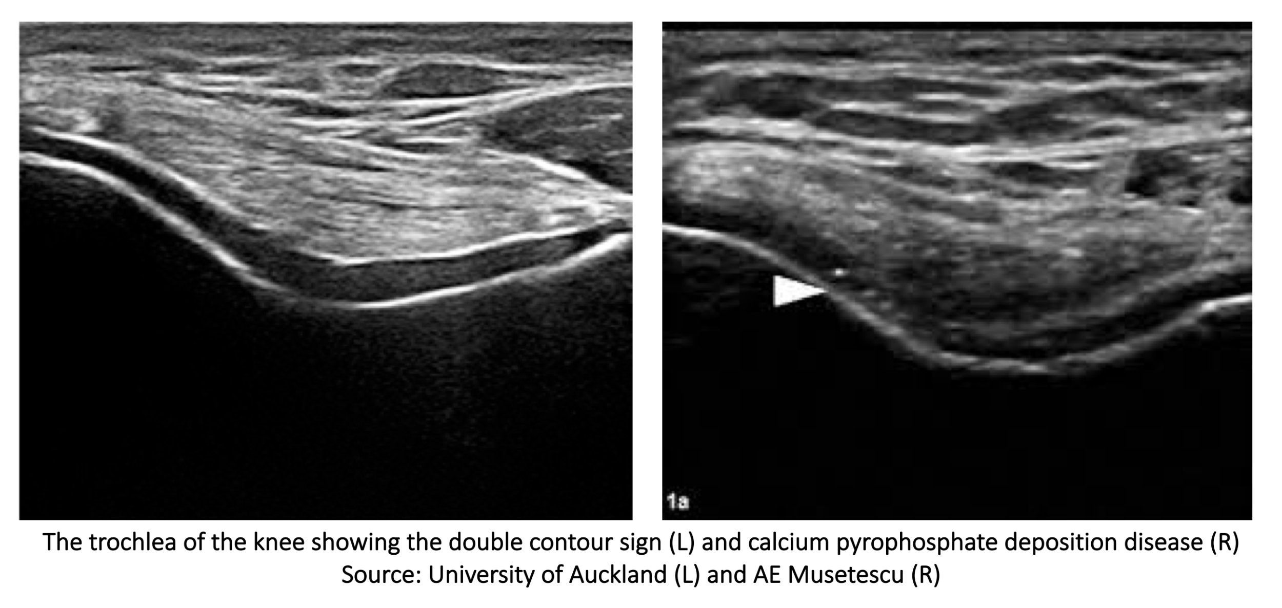 The double contour sign should be distinguished from the cartilage appearance in calcium pyrophosphate deposition disease, where a hyperechoic band from calcium deposits is seen within the middle of the hyaline cartilage, not at the margin.